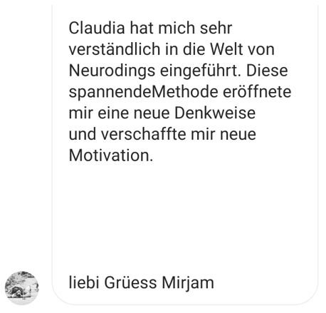 Claudia ist sehr kompetent im unterrichten und vermitteln der Methode. Das es ein Herzensanliegen ist und sie ihren Seelenplan lebt spürt man sofort. Man wird einfach angesteckt von der Lust, Freude und Begeisterung. Welche sie ausstrahlt und lebt. Ich kann Claudia von ganzen Herzen weiterempfehlen und wünsche allen frohes buntes entdecken oder bei Neurodings erarbeiten :) es lohnt sich Zeit für sich zu nehmen.